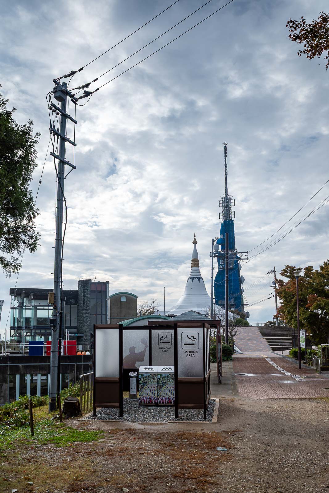 Once at the top, and here is the promised smoking area, Buddhist facility of some kind, and communication tower covered in blue shade cloth.