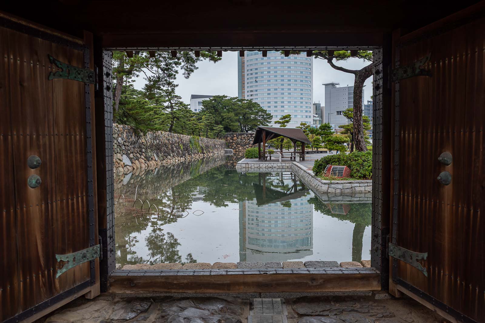 Gate with a view. The moat is interesting, it is sea water, there are not many castles in Japan with a sea water moat.