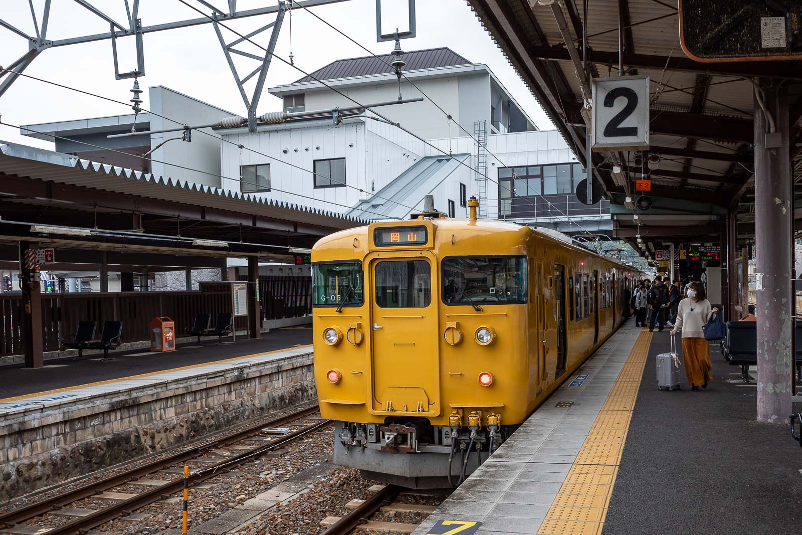Here is the train I rode on from Okayama to Bitchu-Takahashi station in Takahashi. It takes just over an hour on the local train and costs about 800 yen ($8) in each direction, IC card accepted. Takahashi is popular with tourists, there is a Starbucks, and limited express trains stop at the station, but cost more than double to save 20 minutes.