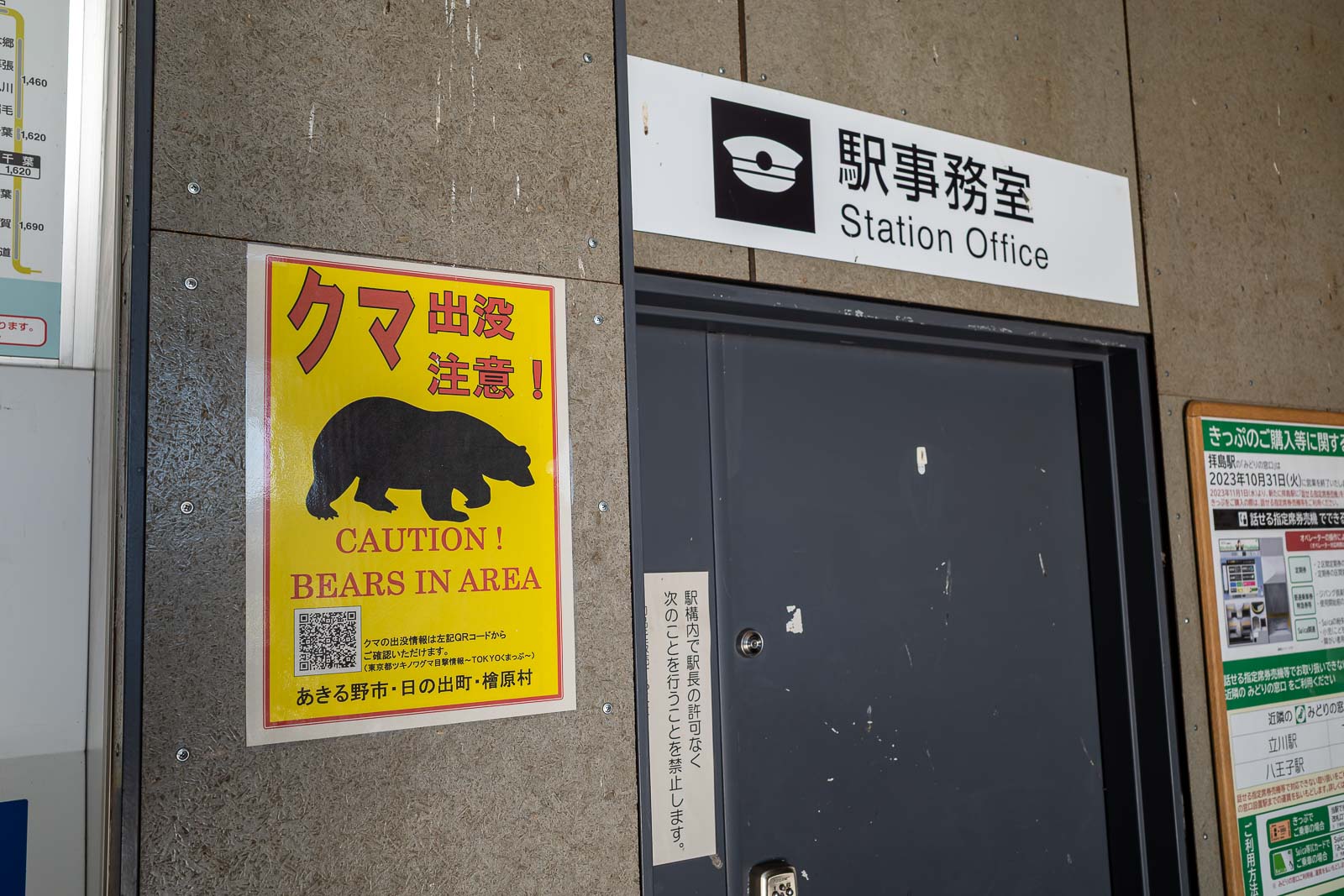 There are at least 10 warning signs about bears in the station, around the station, on the bus stops etc. None have dates about actual sightings and some were quite faded like they had been there for a year.