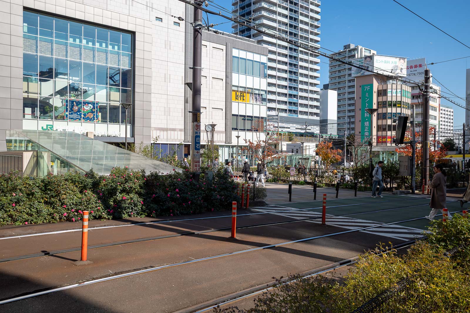 Station 9 of 30 - Otsuka. Hard to read the sign. A tram runs in front of the station.