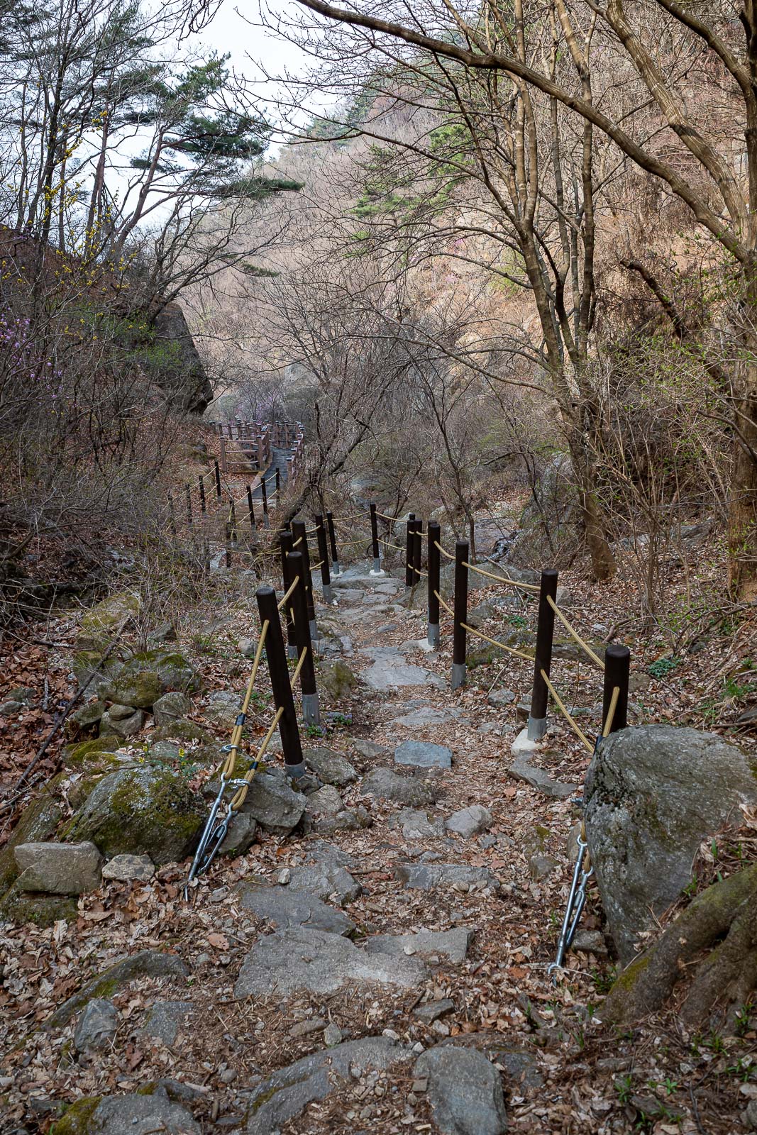 The lower bits have some steps and a lot of ropes. The middle bits have none. At the end, steps and ropes appear again. I guess that is because a lot of people start from either and end don't do the trail that joins the peaks, instead they turn around and go back from whence they came.