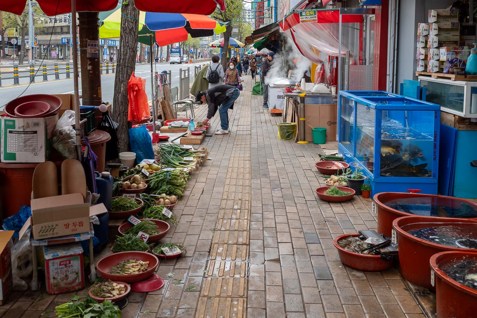 Typical Korean street scene from out the front of any traditional market, ideally I would have got closer to the steam from the dumpling shop (mandoo / mandu), but then I would have missed the vegetables laying in the street.