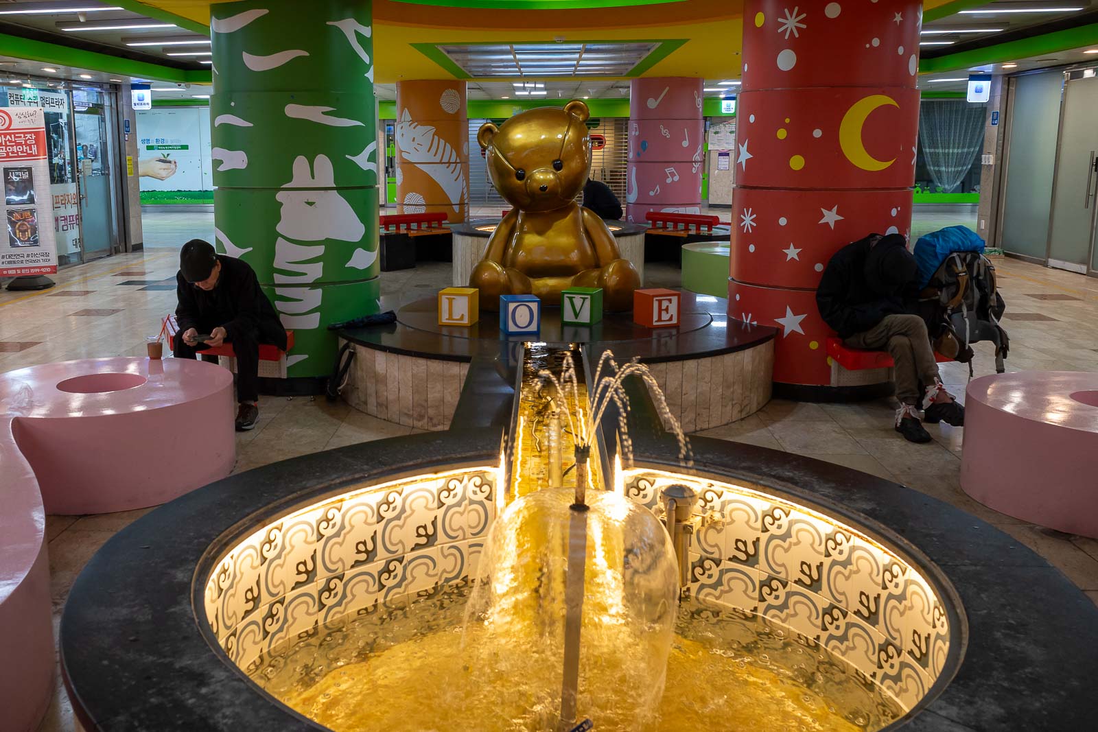 Right at the end where only fortune teller shops are located, a scary teddy bear and a couple of homeless guys.