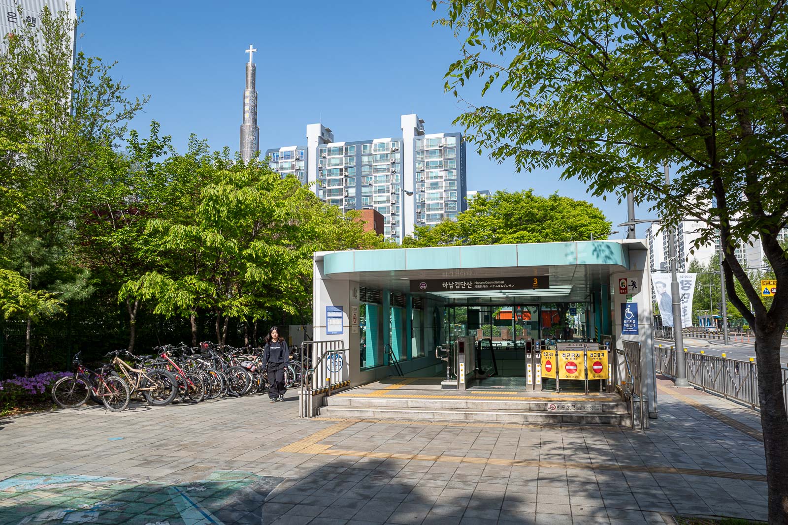 To get here is easy, take the purple line to the end, where the station is named the same as the mountain, Geomdansan. Weird church structure visible.
